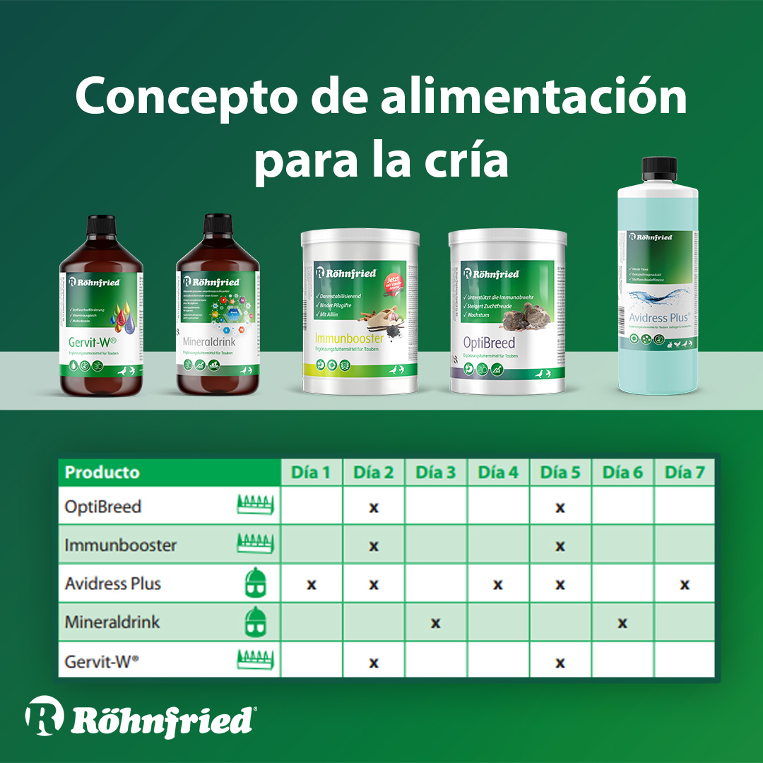 Nuestros productos no solo te apoyan en la fase de preparación, sino a lo largo de toda la temporada de cría. Röhnfried es tu socio para lograr un éxito sostenible en la cría de palomas. Con nuestro enfoque integral, estableces la base para palomas de alto rendimiento.